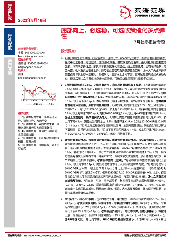 【东海证券】【20230816】7月社零报告专题:底部向上,必选稳,可选政策催化多点弹性-26页