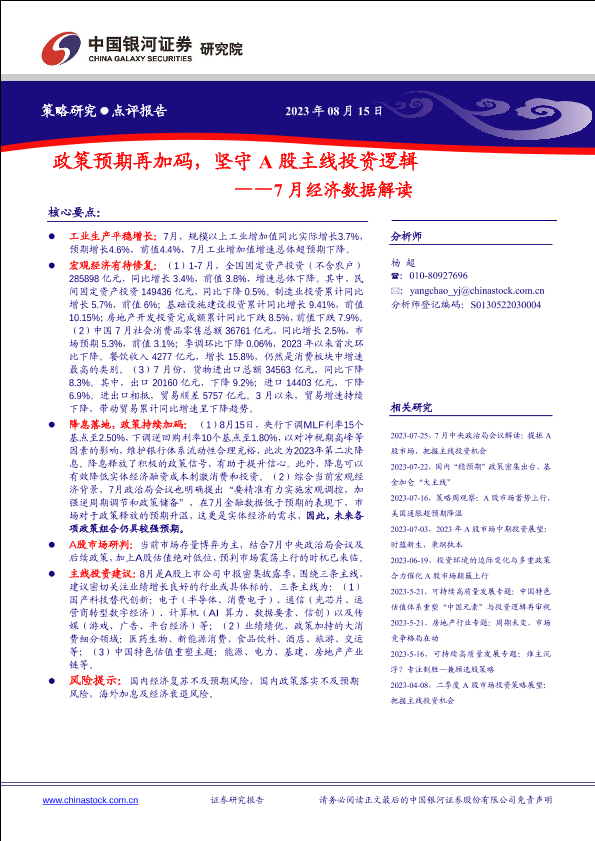 【银河证券】【20230815】7月经济数据解读:政策预期再加码,坚守A股主线投资逻辑-15页