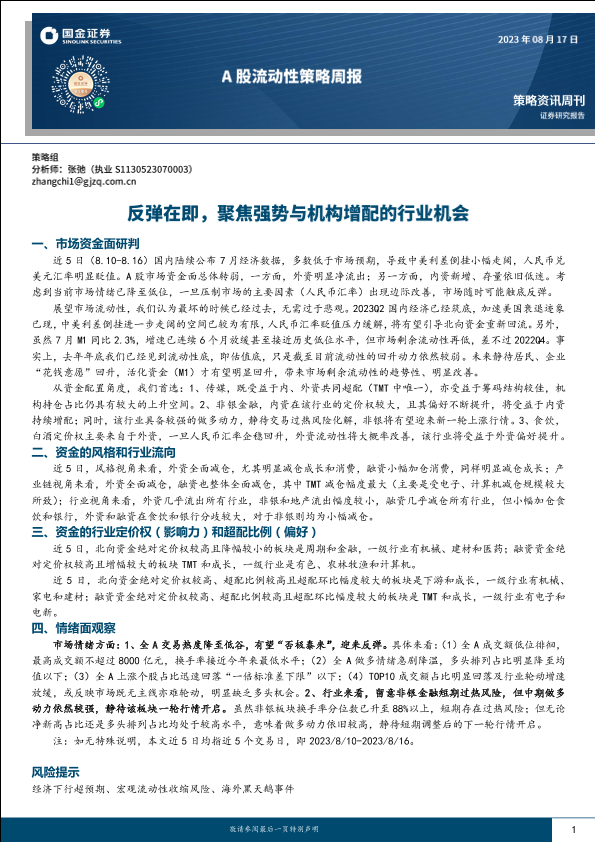 【国金证券】【20230817】A股流动性策略周报:反弹在即,聚焦强势与机构增配的行业机会-22页