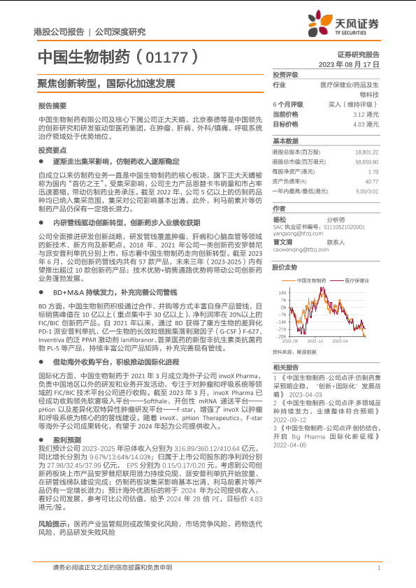 【天风证券】【20230817】中国生物制药(01177)聚焦创新转型,国际化加速发展-44页