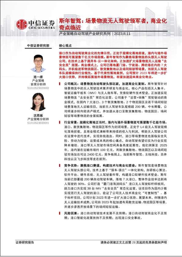 【中信证券】【20230811】产业策略自动驾驶产业研究系列:斯年智驾,场景物流无人驾驶领军者,商业化奇点临近-29页