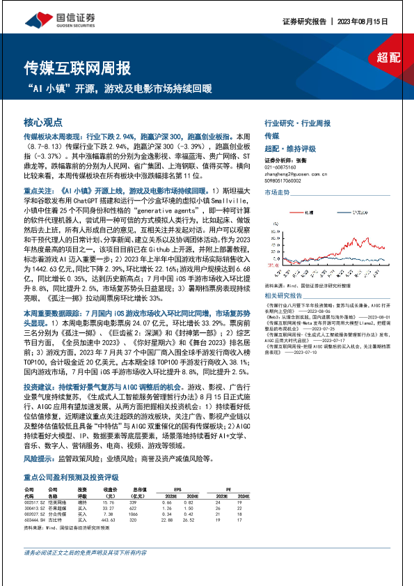 【国信证券】【20230815】传媒互联网周报:“AI小镇”开源,游戏及电影市场持续回暖-20页