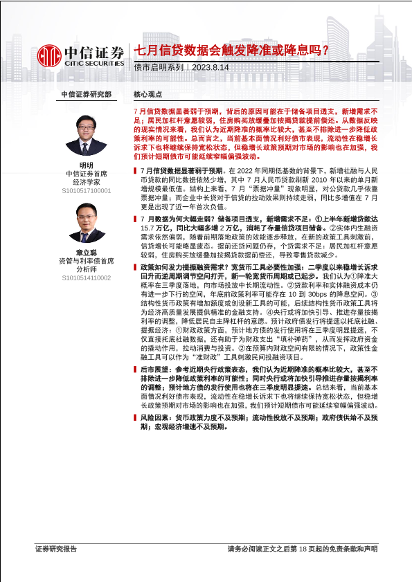 【中信证券】【20230814】债市启明系列:七月信贷数据会触发降准或降息吗?-19页