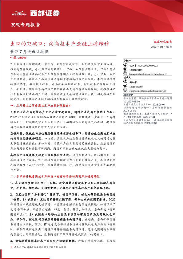【西部证券】【20230808】兼评7月进出口数据:出口的突破口,向高技术产业链上游转移-19页