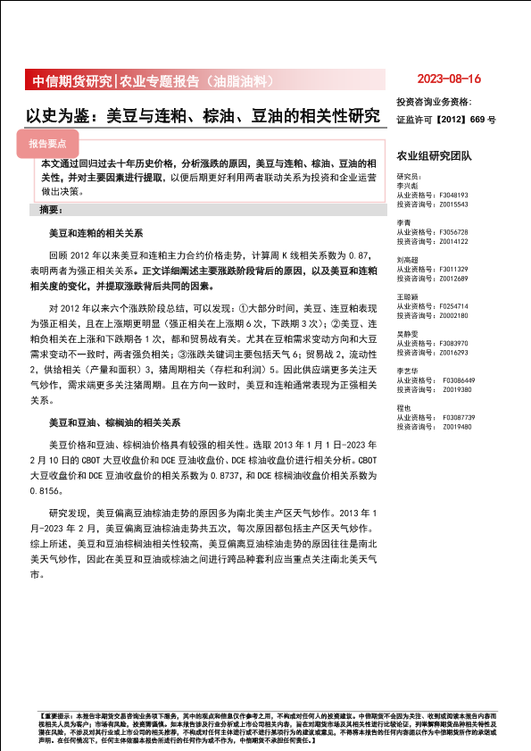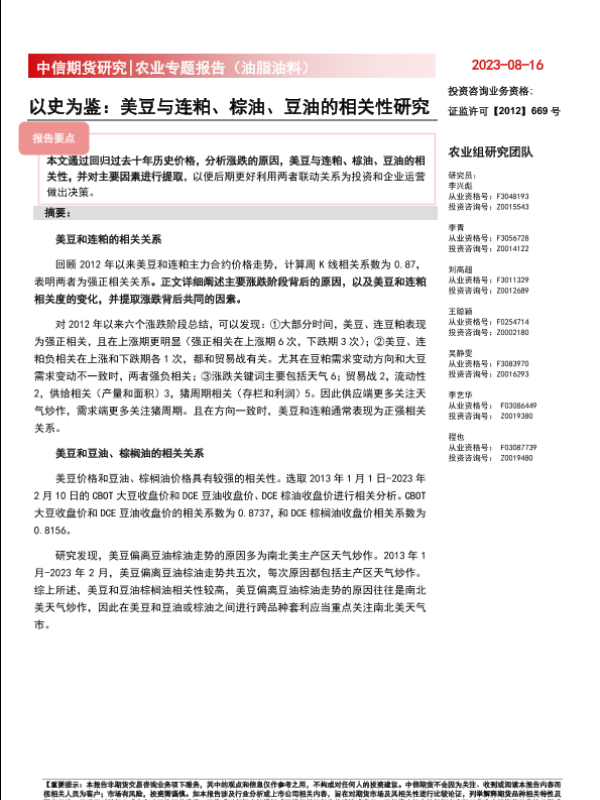 【中信期货】【20230816】农业专题报告(油脂油料):以史为鉴,美豆与豆粕、棕油、豆油的相关性研究-26页