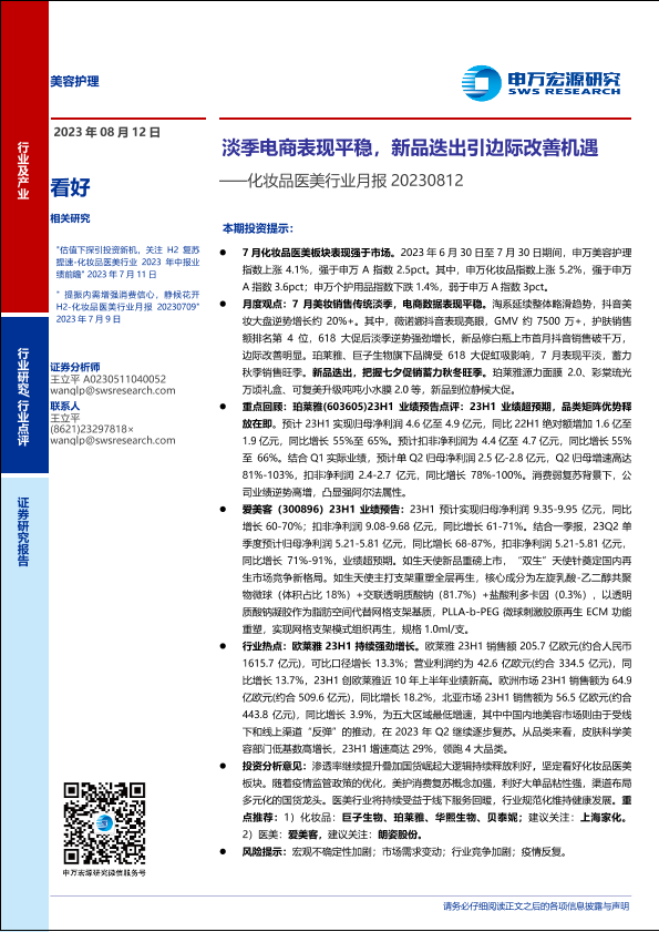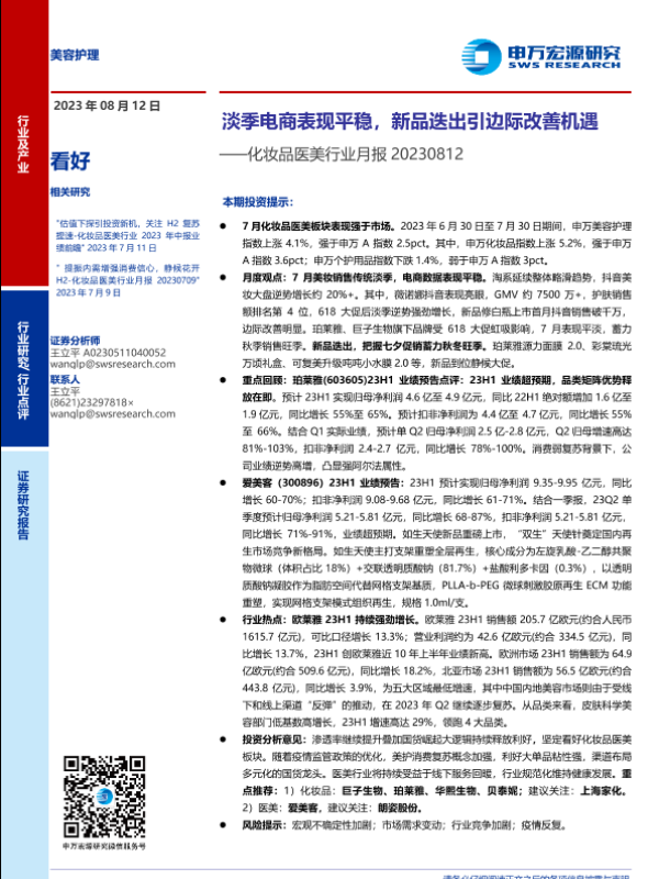 【申万宏源】【20230812】化妆品医美行业月报:淡季电商表现平稳,新品迭出引边际改善机遇-15页