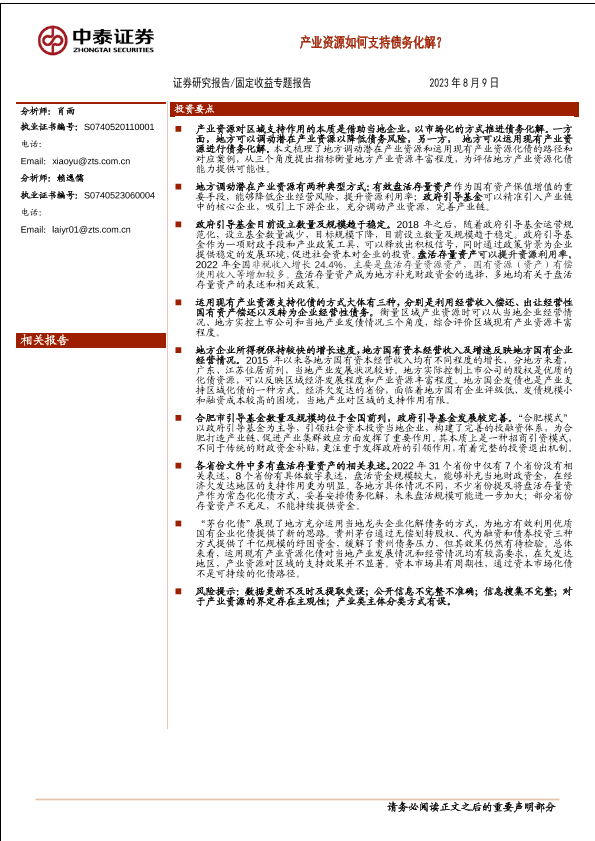 【中泰证券】【20230809】固定收益专题报告:产业资源如何支持债务化解?-18页