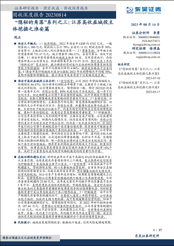 【东吴证券】【20230814】固收深度报告:“隐秘的角落”系列之三,江苏高收益城投主体挖掘之淮安篇-37页