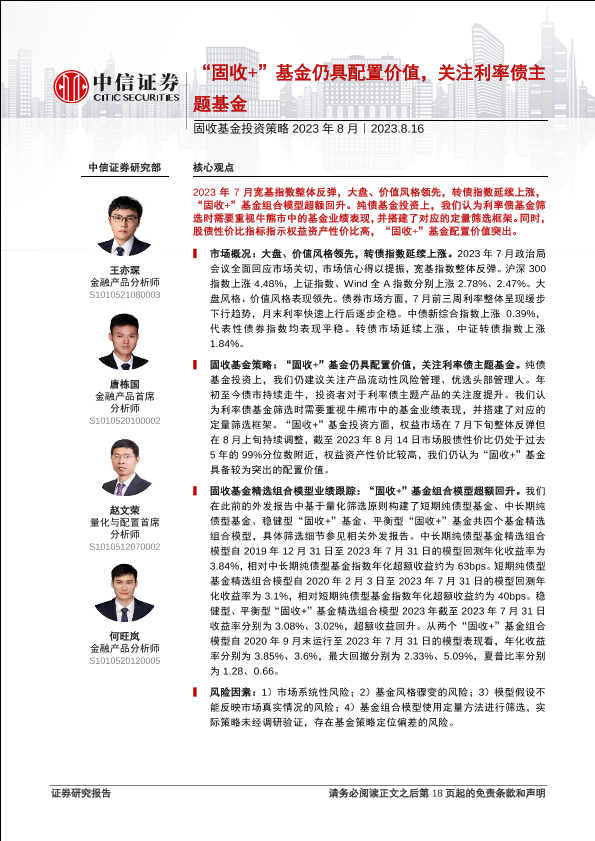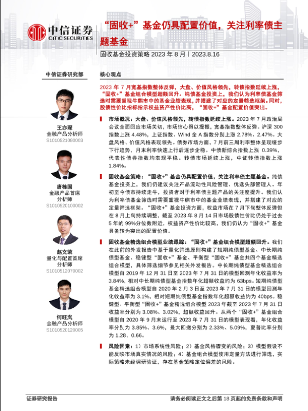 【中信证券】【20230816】固收基金投资策略2023年8月:“固收+”基金仍具配置价值,关注利率债主题基金-19页