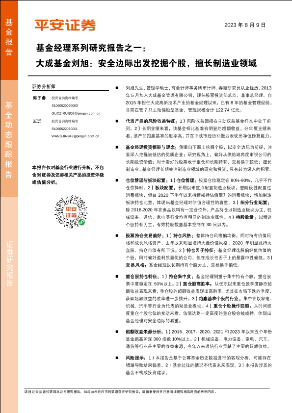 【平安证券】【20230809】基金经理系列研究报告之一:大成基金刘旭,安全边际出发挖掘个股,擅长制造业领域-15页