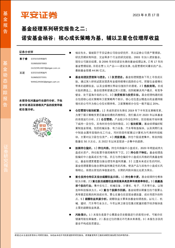 【平安证券】【20230817】基金经理系列研究报告之二:诺安基金杨谷,核心成长策略为基,辅以卫星仓位增厚收益-16页