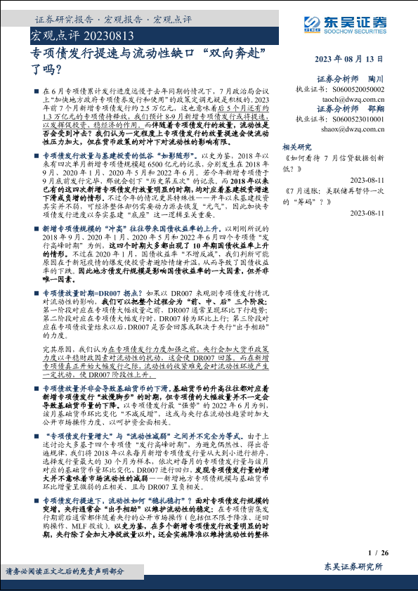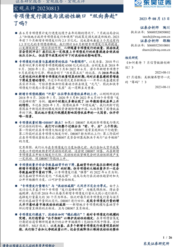 【东吴证券】【20230813】宏观点评:专项债发行提速与流动性缺口“双向奔赴”了吗?-26页