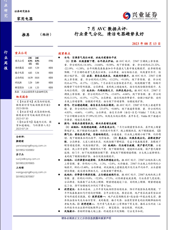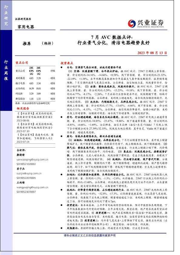 【兴业证券】【20230813】家用电器行业7月AVC数据点评:行业景气分化,清洁电器趋势良好-21页