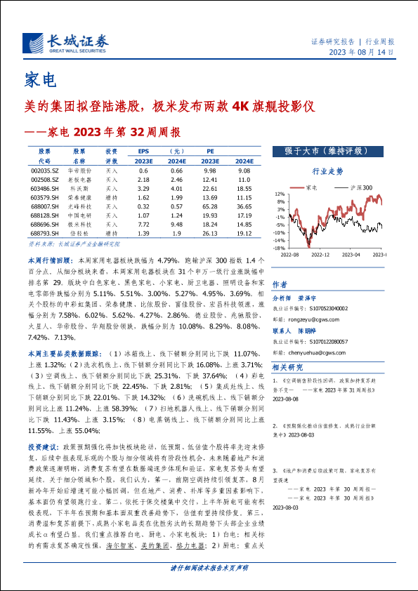 【长城证券】【20230814】家电2023年第32周周报:美的集团拟登陆港股,极米发布两款4K旗舰投影仪-31页