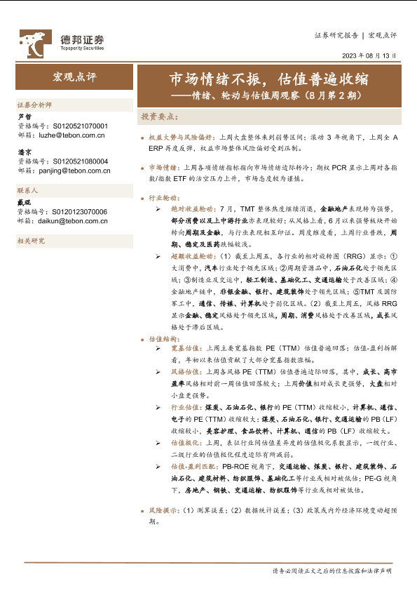 【德邦证券】【20230813】情绪、轮动与估值周观察(8月第2期):市场情绪不振,估值普遍收缩-21页