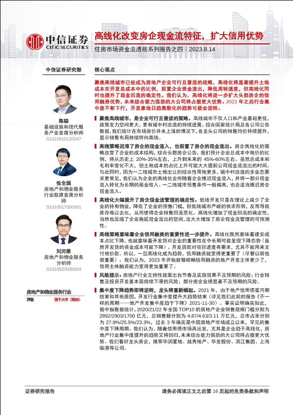 【中信证券】【20230814】房地产和物业服务行业住房市场资金流透视系列报告之四:高线化改变房企现金流特征,扩大信用优势-17页