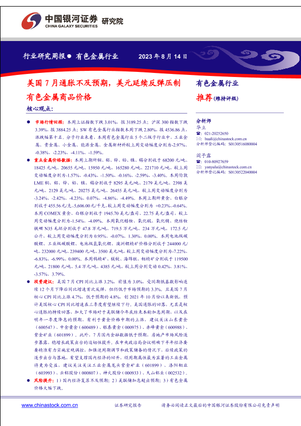 【银河证券】【20230814】有色金属行业行业研究周报:美国7月通胀不及预期,美元延续反弹压制有色金属商品价格-20页