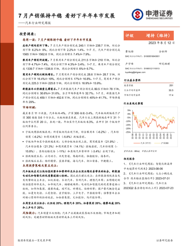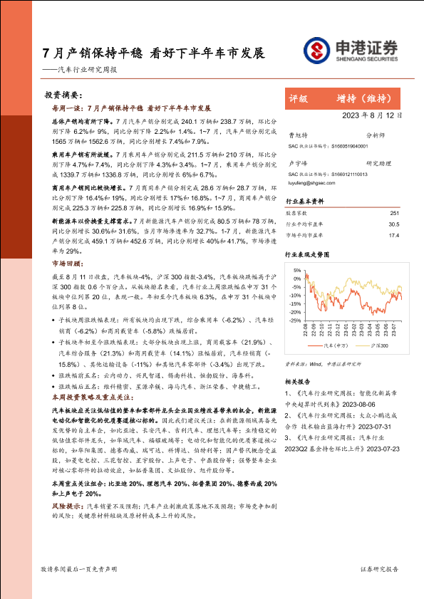 【申港证券】【20230812】汽车行业研究周报:7月产销保持平稳看好下半年车市发展-15页