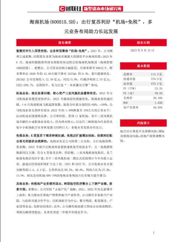 【海南证券】【20230815】海南机场(600515)出行复苏利好“机场+免税”,多元业务布局助力长远发展-30页