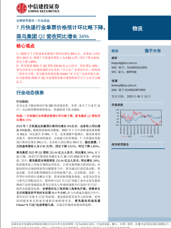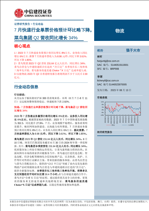 【中信建投证券】【20230813】物流行业:7月快递行业单票价格预计环比略下降,菜鸟集团Q2营收同比增长34%-25页