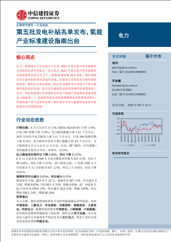 【中信建投证券】【20230813】电力行业:第五批发电补贴名单发布,氢能产业标准建设指南出台-16页