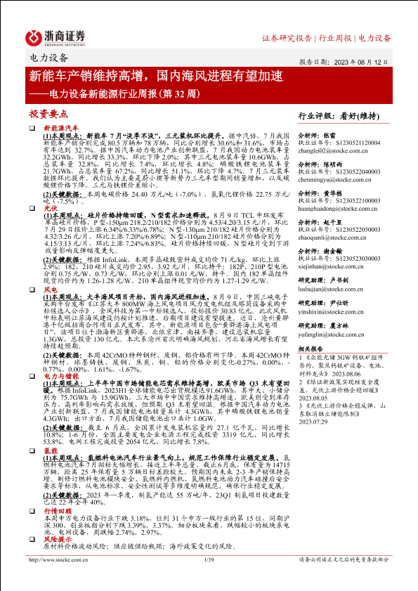 【浙商证券】【20230812】电力设备新能源行业周报(第32周):新能车产销维持高增,国内海风进程有望加速-39页