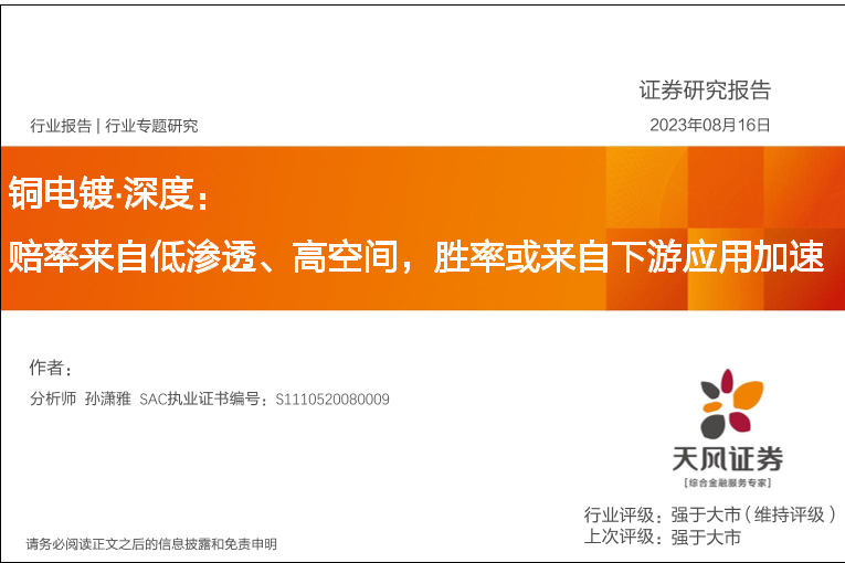 【天风证券】【20230816】电力设备行业铜电镀·深度:赔率来自低渗透、高空间,胜率或来自下游应用加速-31页