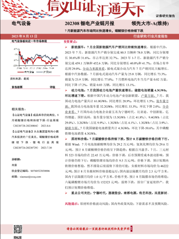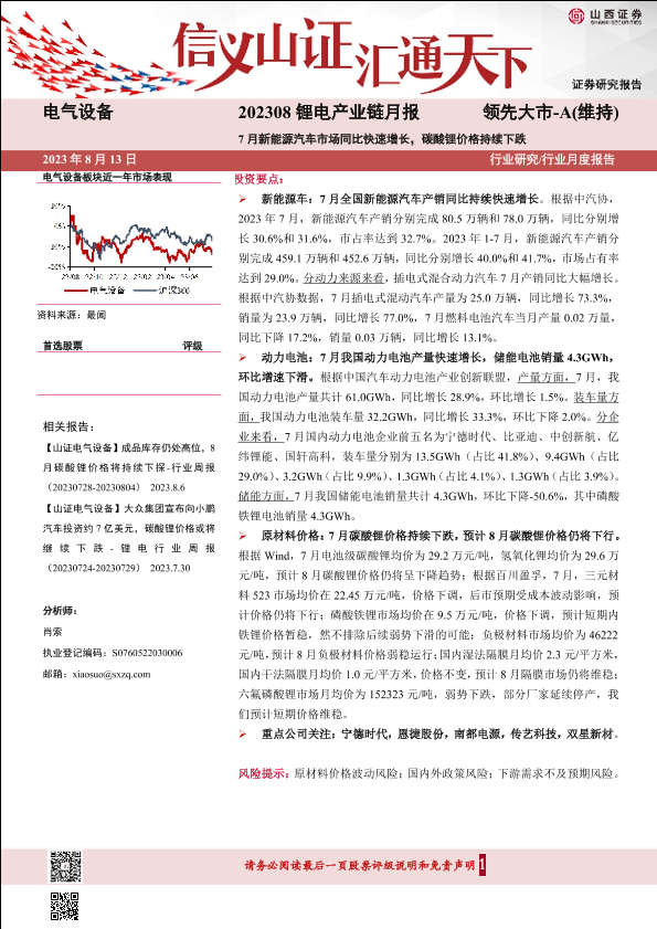 【山西证券】【20230813】电气设备行业202308锂电产业链月报:7月新能源汽车市场同比快速增长,碳酸锂价格持续下跌-15页