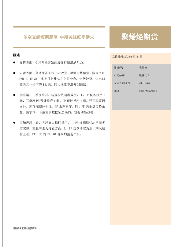 【大越期货】【20230711】聚烯烃期货:多空交织短期震荡,中期关注旺季需求-21页
