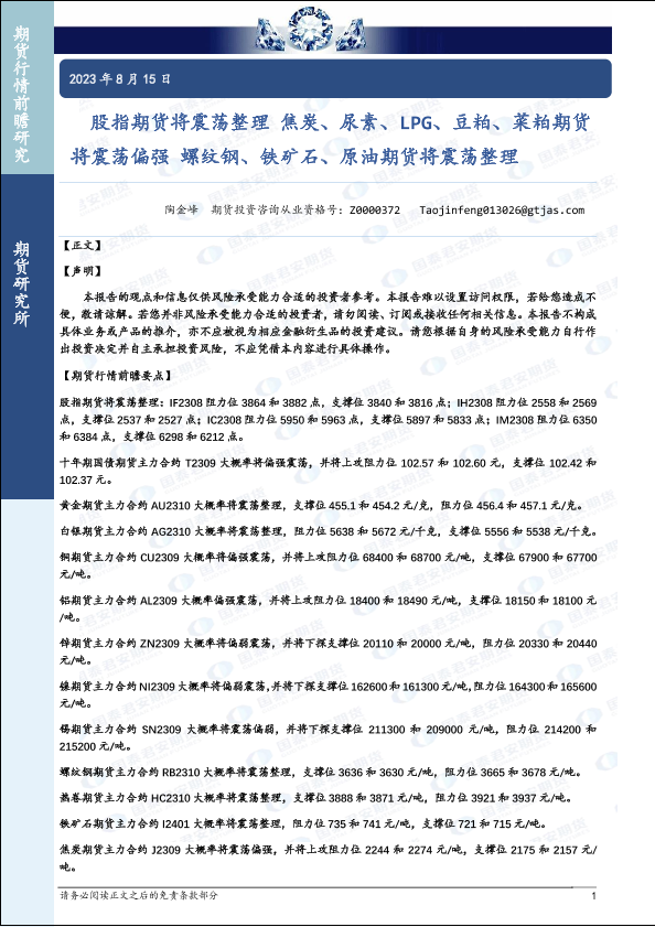 【国泰君安期货】【20230815】股指期货将震荡整理,焦炭、尿素、LPG、豆粕、菜粕期货将震荡偏强,螺纹钢、铁矿石、原油期货将震荡整理-43页