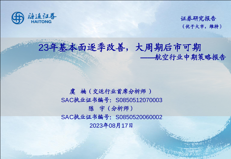 【海通证券】【20230817】航空行业中期策略报告:23年基本面逐季改善,大周期后市可期-39页