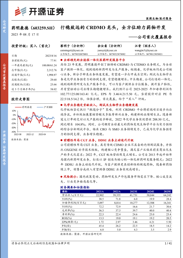 【开源证券】【20230817】药明康德(603259)公司首次覆盖报告:行稳致远的CRDMO龙头,全方位助力药物开发-41页
