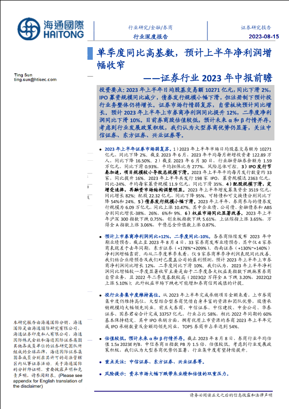 【海通国际】【20230815】证券行业2023年中报前瞻:单季度同比高基数,预计上半年净利润增幅收窄-25页