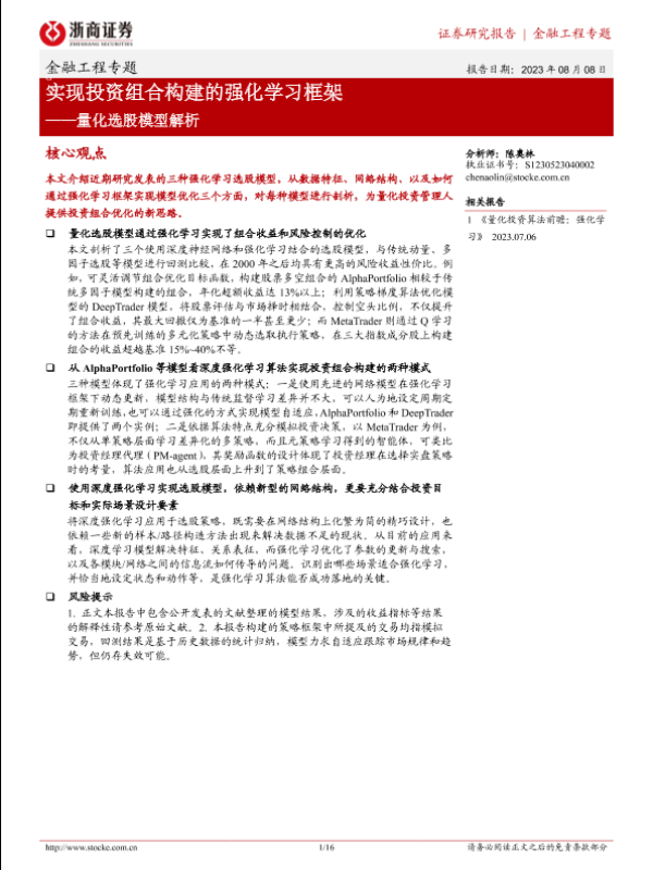 【浙商证券】【20230808】量化选股模型解析:实现投资组合构建的强化学习框架-16页