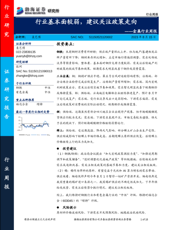 【渤海证券】【20230815】金属行业周报:行业基本面较弱,建议关注政策走向-18页