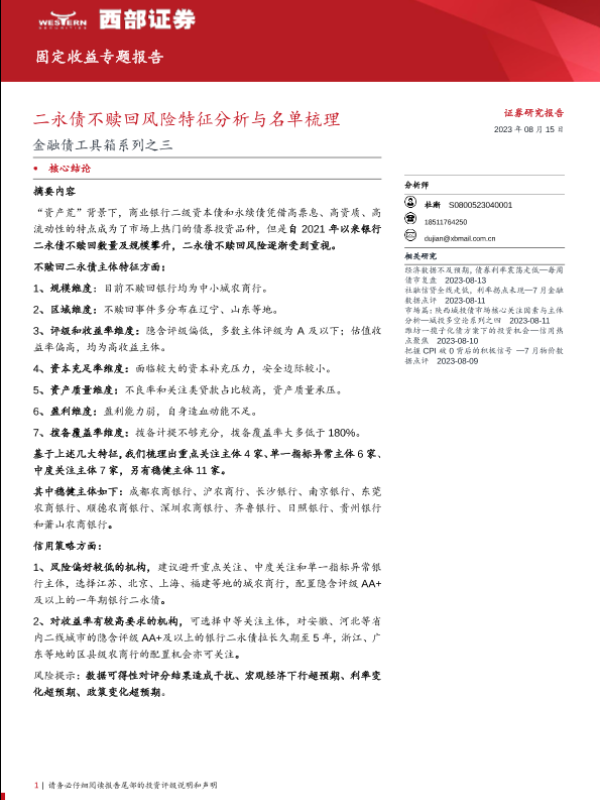 【西部证券】【20230815】金融债工具箱系列之三:二永债不赎回风险特征分析与名单梳理-27页