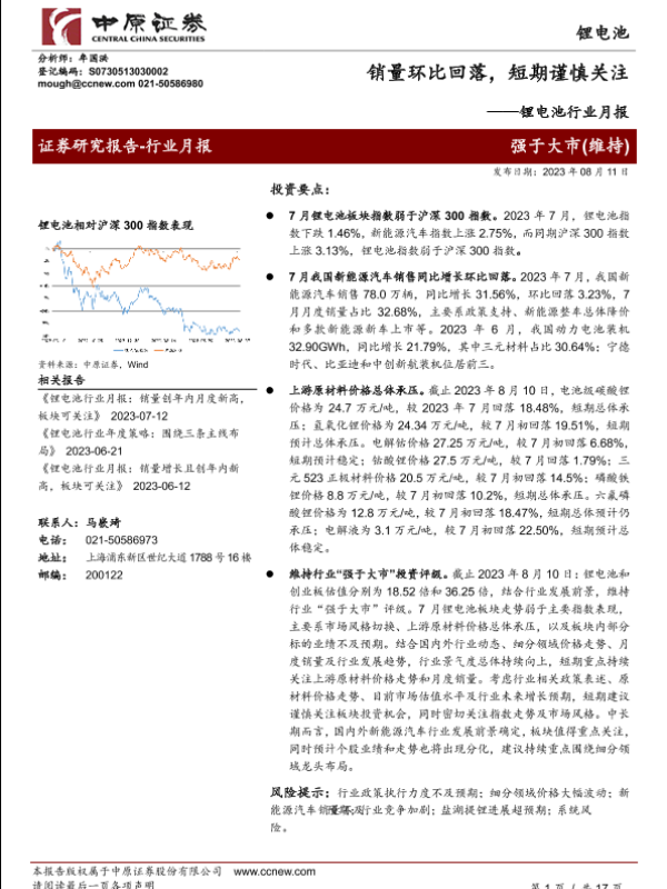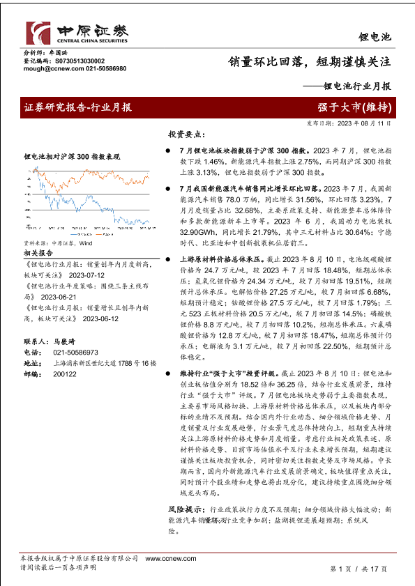 【中原证券】【20230811】锂电池行业月报:销量环比回落,短期谨慎关注-17页
