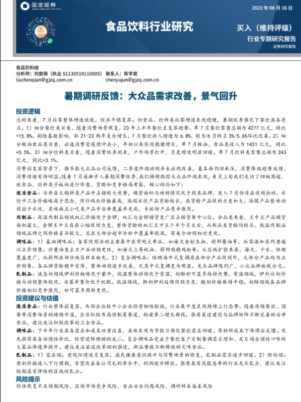 【国金证券】【20230816】食品饮料行业专题研究报告:暑期调研反馈,大众品需求改善,景气回升-16页