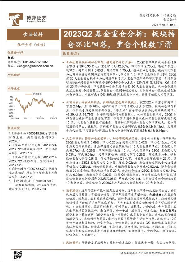 【德邦证券】【20230810】食品饮料行业2023Q2基金重仓分析:板块持仓环比回落,重仓个股数下滑-17页