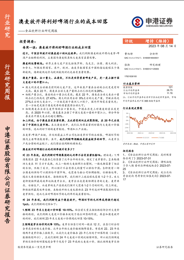 【申港证券】【20230814】食品饮料行业研究周报:澳麦放开将利好啤酒行业的成本回落-22页