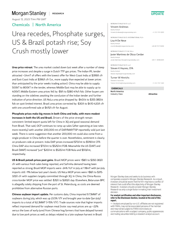 【Morgan Stanley】【20230815】Morgan Stanley - 化学品尿素回落,磷酸盐激增,美国和巴西钾肥上涨;大豆压榨大多走低-41页