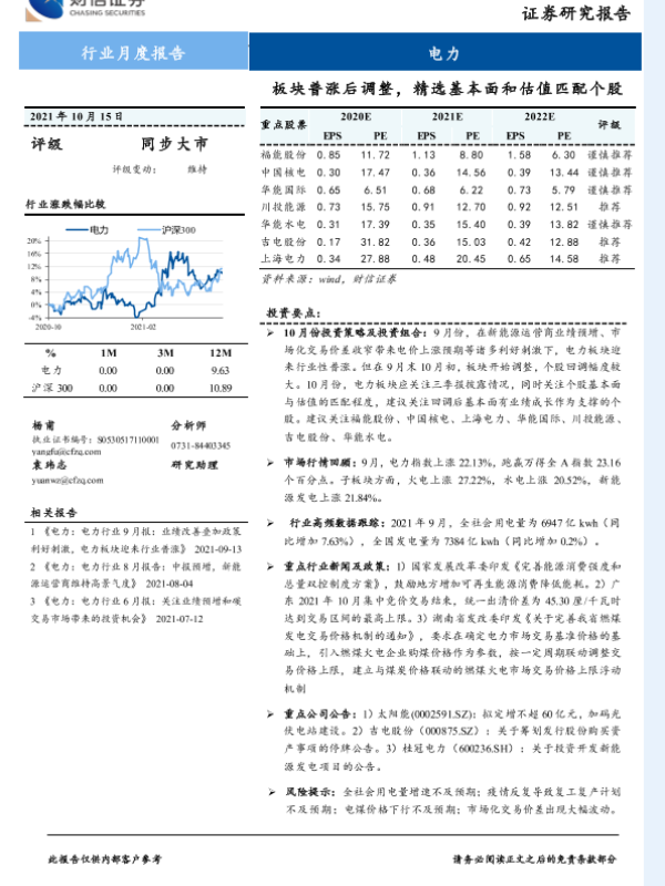 【财信证券】【20211015】电力行业月度报告:板块普涨后调整,精选基本面和估值匹配个股-15页