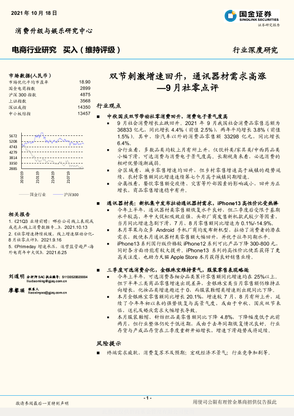【国金证券】【20211018】电商行业9月社零点评:双节刺激增速回升,通讯器材需求高涨-18页