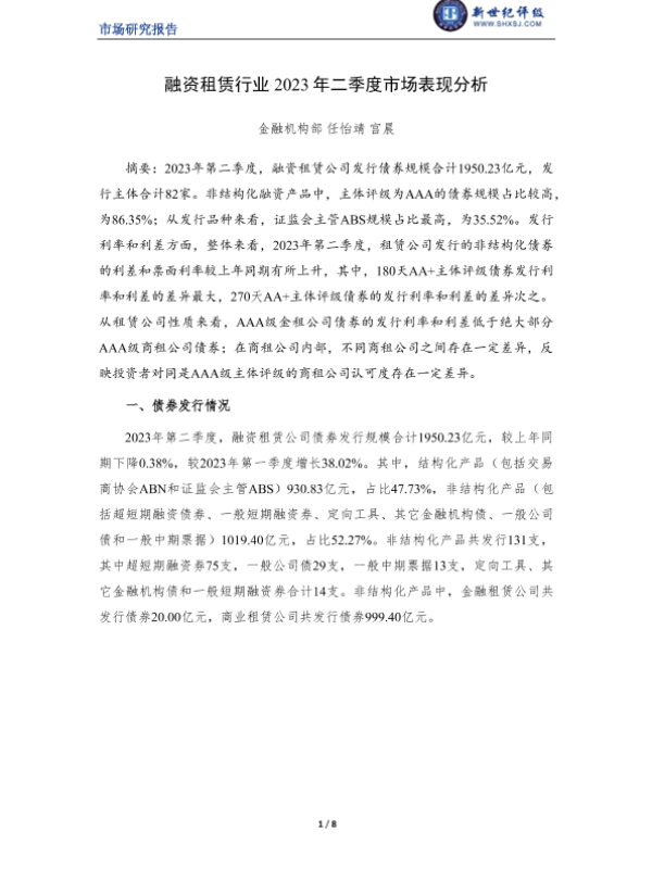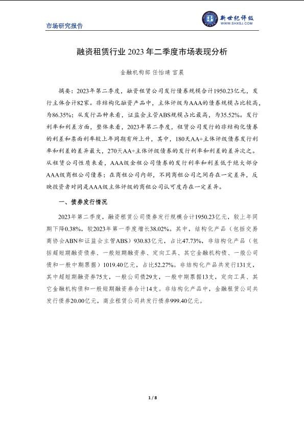 【新世纪评级】【20230630】融资租赁行业2023年二季度市场表现分析-8页