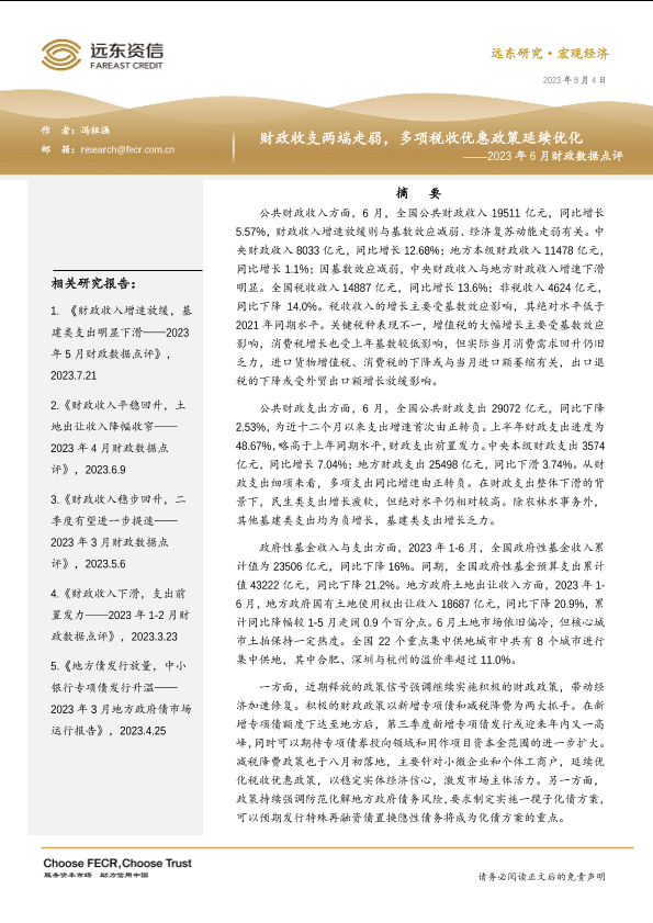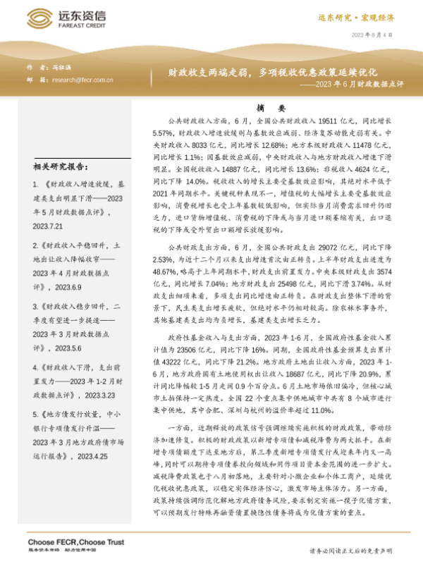 【远东资信】【20230804】财政收支两端走弱,多项税收优惠政策延续优化——2023年6月财政数据点评-13页