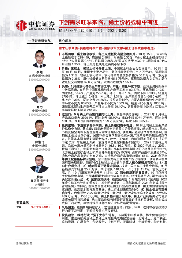 【中信证券】【20211020】稀土行业半月谈(10月上):下游需求旺季来临,稀土价格或稳中有进-38页