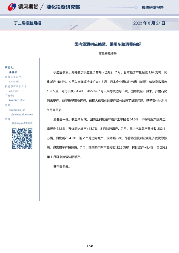【银河期货】【20230827】丁二烯橡胶月报:国内货源供应偏紧,乘用车胎消费向好-41页