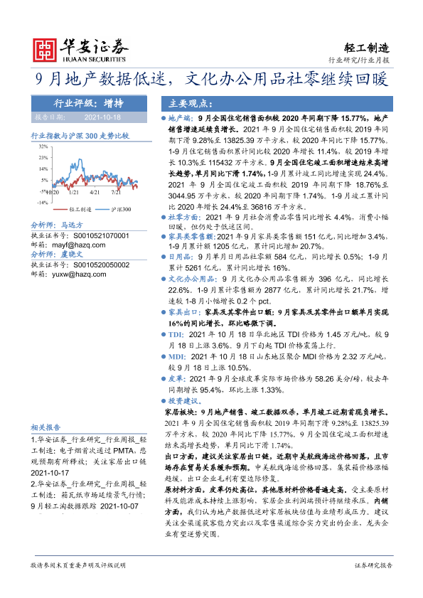 【华安证券】【20211018】轻工制造行业月报:9月地产数据低迷,文化办公用品社零继续回暖-23页