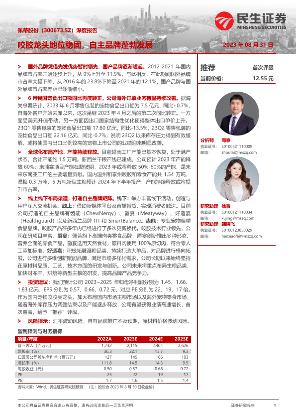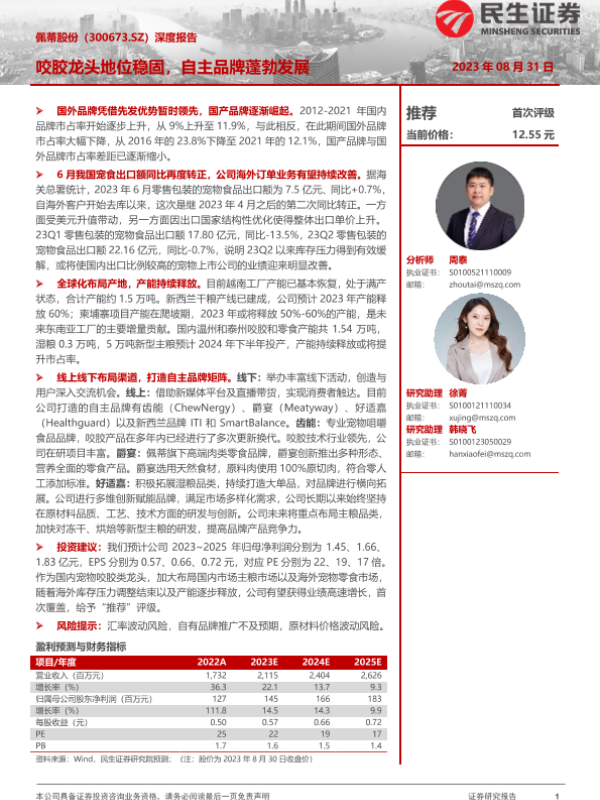 【民生证券】【20230831】佩蒂股份-300673.SZ-深度报告:咬胶龙头地位稳固,自主品牌蓬勃发展-34页