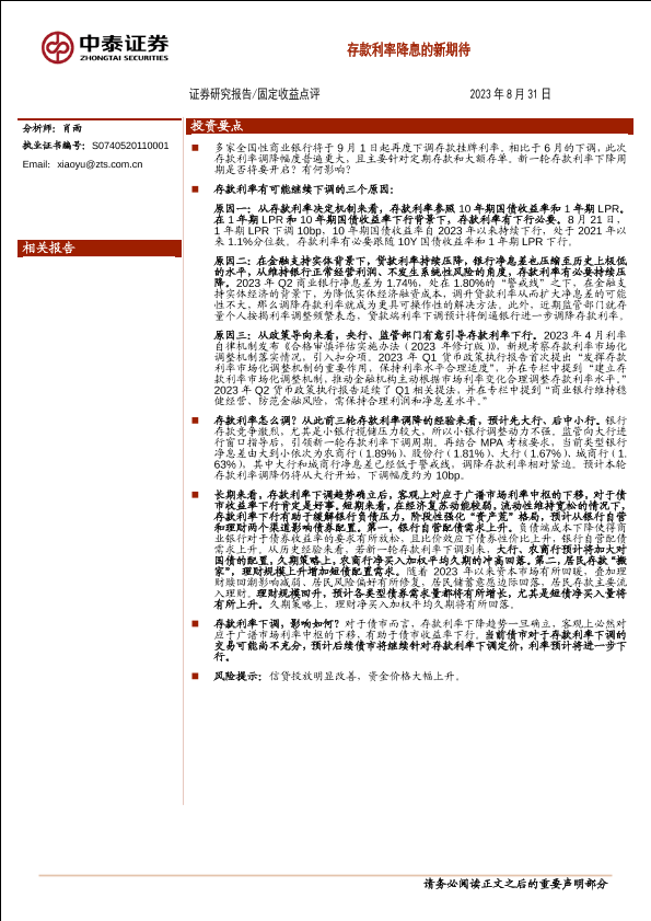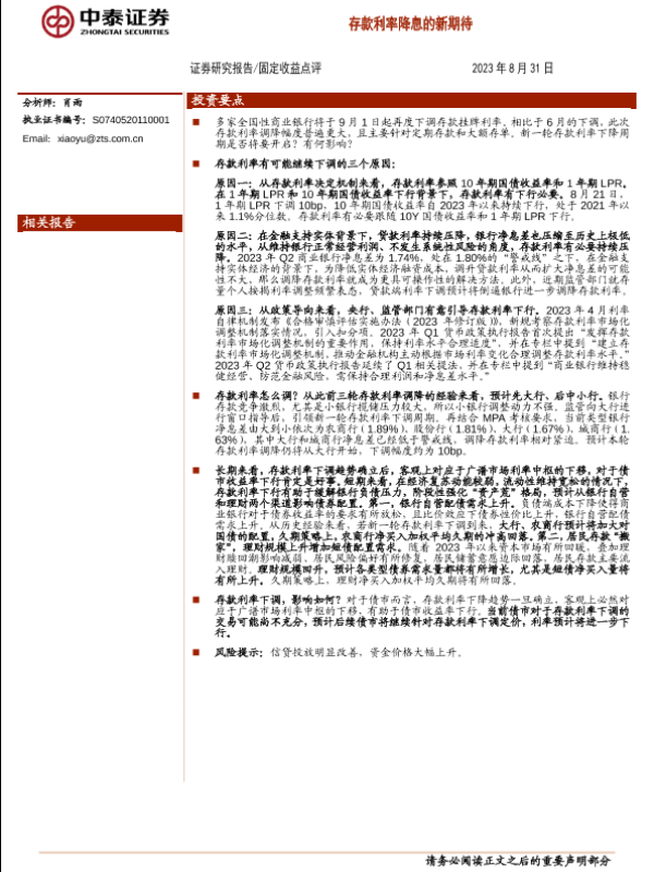 【中泰证券】【20230831】固定收益点评:存款利率降息的新期待-17页